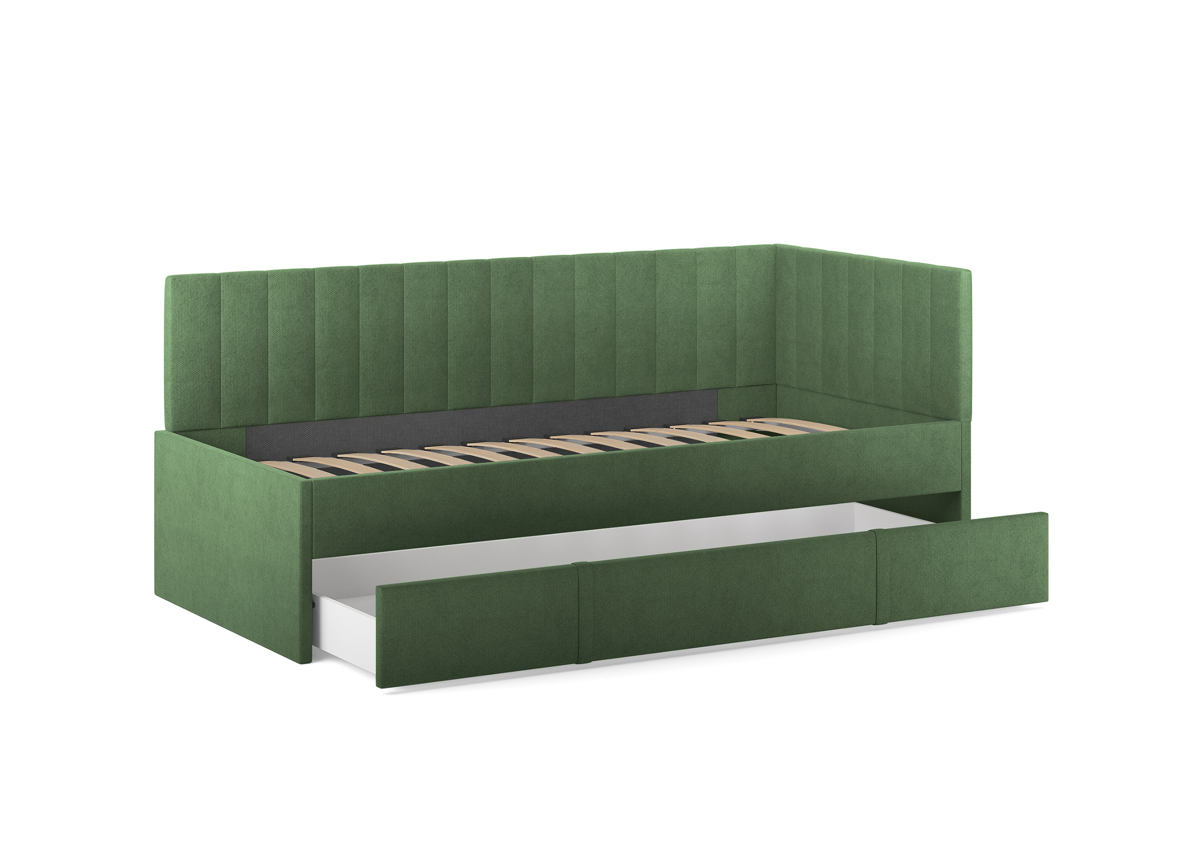 Искали детскую кровать для ребёнка и влюбились в неё с первого взгляда, когда увидели в салоне. Очень красивая ткань, приятный цвет, кровать выглядит аккуратно и стильно. Большой выдвижной ящик, выдвигается без заеданий, туда спокойно помещается постельное бельё и игрушки — он действительно вместительный. Нравится, что есть армирующие ламели: основание прочное, не прогибается, создаёт ощущение надёжности. Отличный вариант для детской, и по дизайну, и по удобству.